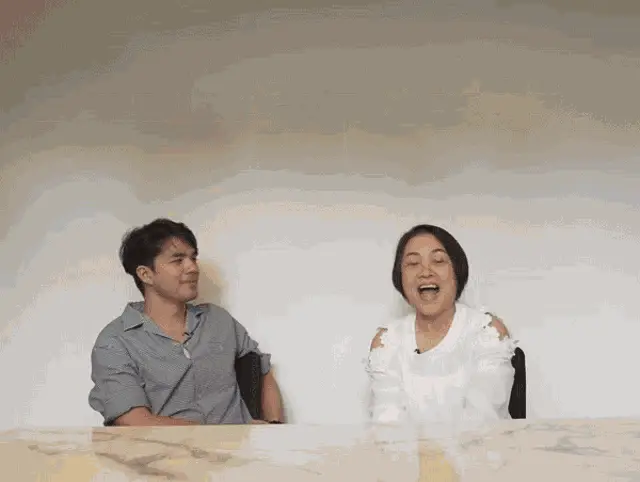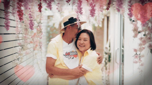 Wan Thanakrit's father kisses his mother on the cheek, surrounded by flowers, celebrating their happy retirement.