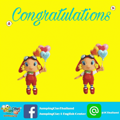Two cute cartoon characters from Jumping Clay Thailand celebrate with heart-shaped balloons.