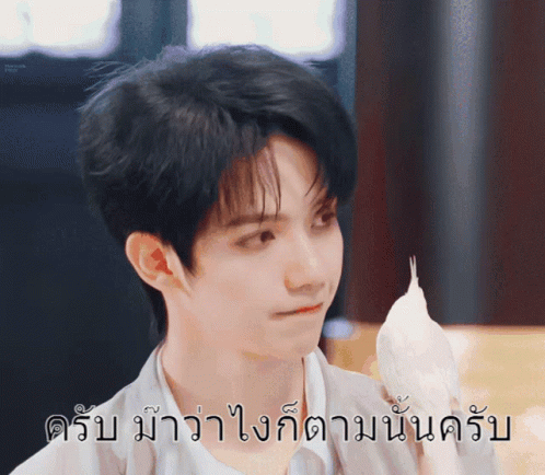 Luo Yizhou holds a small white bird, with a Thai caption saying 'Yes, whatever you say, I'll follow.'