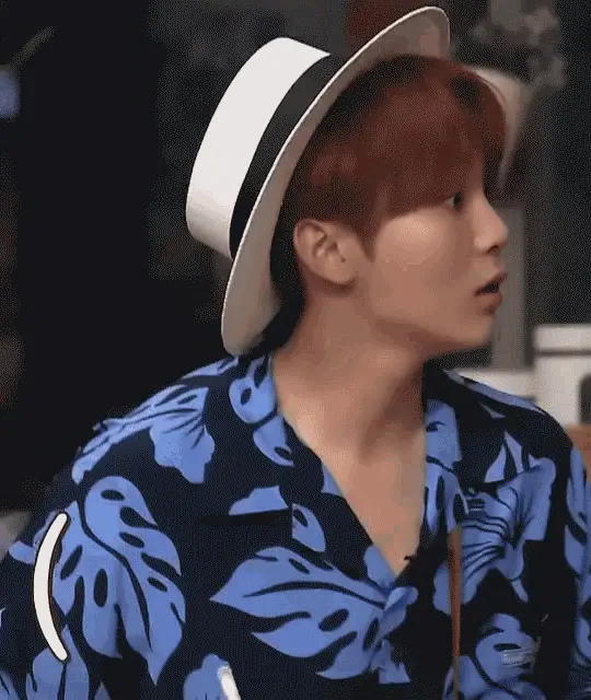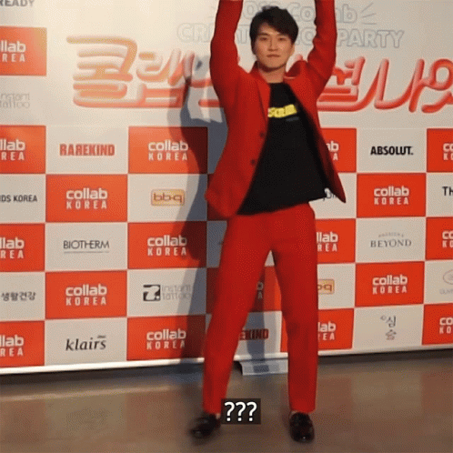 Yoonpic strikes a confident question mark pose in a red suit at the Collab Korea Creator Party.