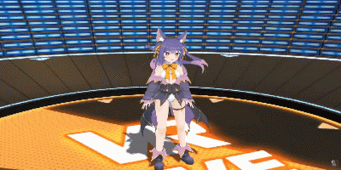 a girl with purple hair is standing in a circle with the letter v on the ground
