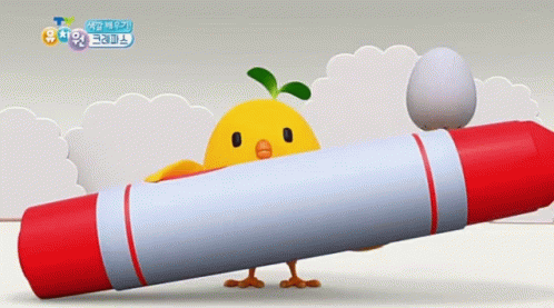 Ppia, the yellow cartoon chick, holds a giant red crayon in this clip from TV Kindergarten.