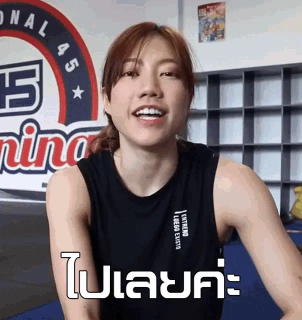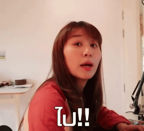 Sunbeary from Bearhug Family reacting with the Thai phrase 'ไป!!' (Go!!) at her desk.