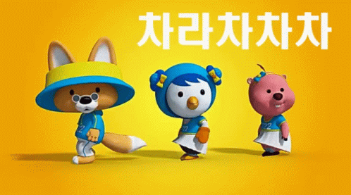 Eddy, Petty, and Loppy from Pororo dancing to Cha Cha Cha on a yellow background.