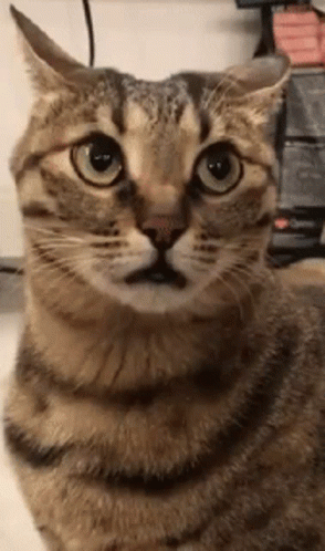 Close-up of a tabby cat with a suspicious or surprised expression, looking directly at the camera.