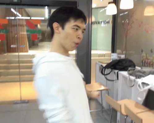 Man dancing with a wavy yellow line effect in front of a glass door with 'INNOVATION' visible.