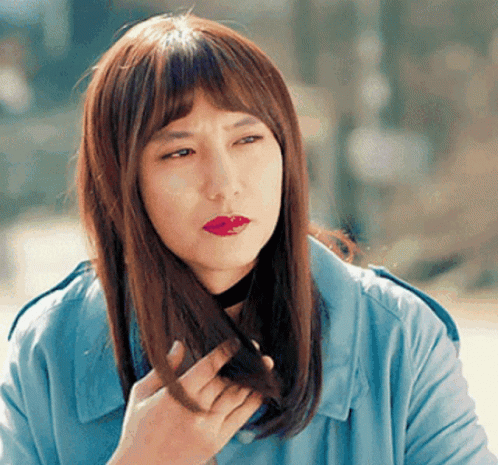 Kim Namgil in a beautiful and proud feminine look, wearing a blue jacket, red lipstick, and a black choker.