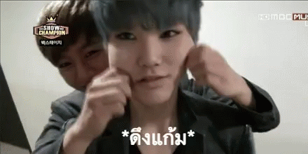 B.A.P's Zelo gets his cheeks playfully pinched by another member backstage at Show Champion.