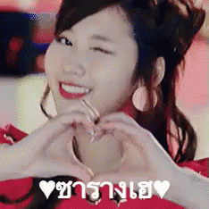 Sana from Twice smiles and makes a heart shape with her hands, expressing 'Saranghae'.