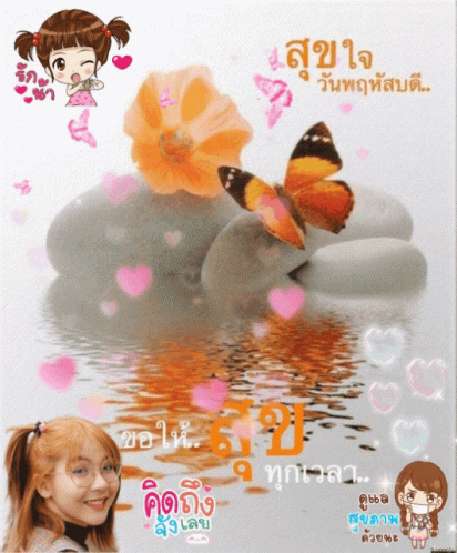 Animated greeting card with a butterfly, flower, and hearts, wishing happiness and good health on Thursday.