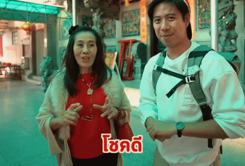 Wahnchai and a woman in a Thai temple, wishing good fortune and exploring the culture.