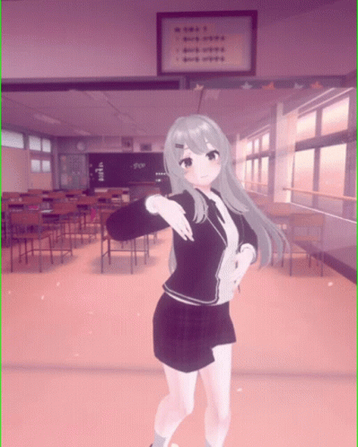 Viichan (비챤) from ISEGYE IDOL dances in a school uniform in a classroom, performing a cute 'finger gun' move.