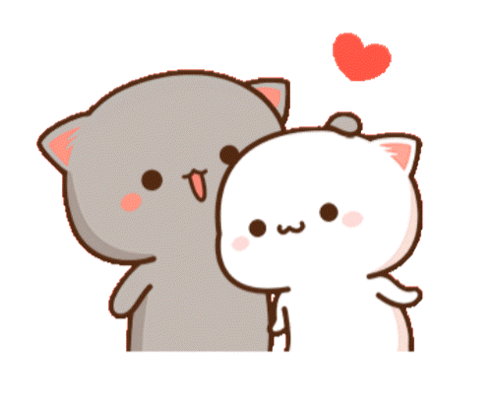 Mochinyang cartoon cats, one grey and one white, stand affectionately together with a red heart above them.