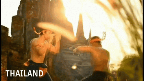 Two men engage in traditional Muay Thai training amidst ancient temple ruins in Thailand, showcasing the martial art's heritage.