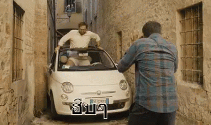 A white Fiat 500 convertible is stuck in a very narrow alley, with a man standing out of the sunroof.