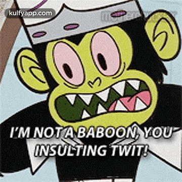 Mojo Jojo from Powerpuff Girls angrily declares, 'I'm not a baboon, you insulting twit!'