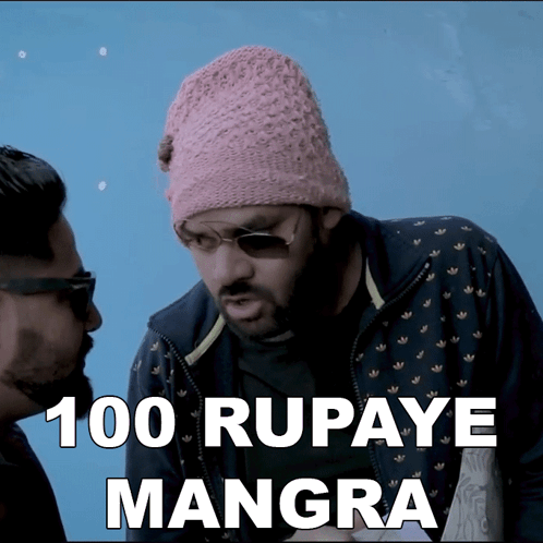 Balraj, wearing a pink hat, asks for 100 rupees from another man, with the caption '100 Rupaye Mangra'.