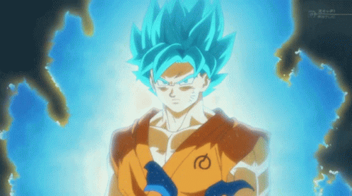Goku from Dragon Ball Z in his powerful Super Saiyan Blue form, surrounded by a vibrant blue aura.