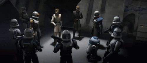 Star Wars 104th Battalion clone troopers hold a war council, planning their next move with Jedi and droids.