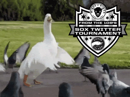 A goose stands among pigeons with the 'Sox Twitter Tournament' logo featuring 'Goose Island' branding.