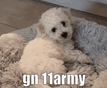A small white puppy on a fluffy blanket with 'gn 11army' text.