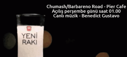 A glass of Yeni Raki, a traditional Turkish alcoholic beverage, with event details for an opening featuring Benedict Gustav.