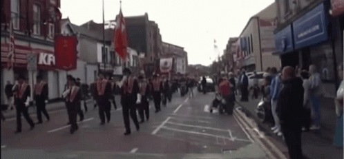 Men in Orange Order attire march in a 12th July parade down a street in Northern Ireland, passing a KFC.