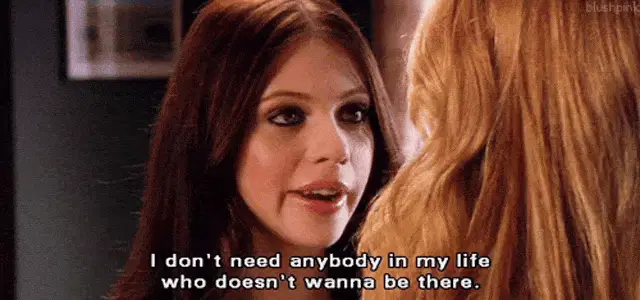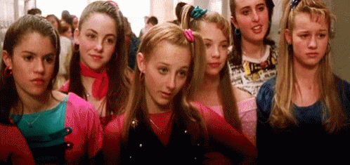 Young girls from 13 Going on 30 in a hallway, their expressions changing from serious to smiling.