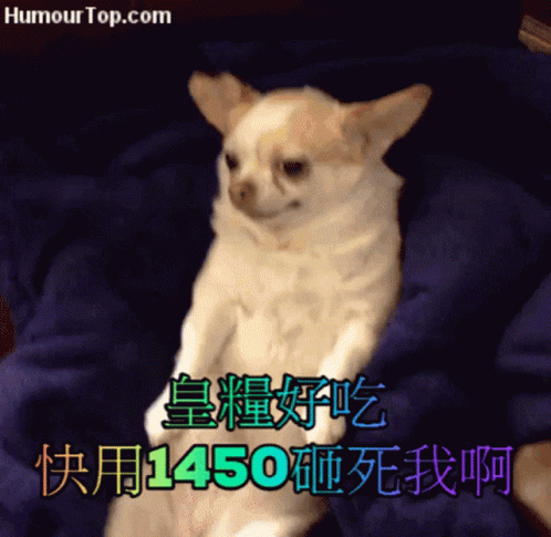 A cute chihuahua dog sits up, then lies down as Oreo cookies fall on it, with a sarcastic Chinese meme about the "1450" internet army.