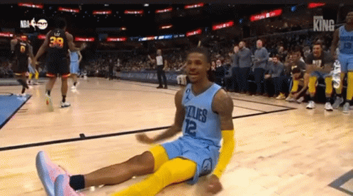Ja Morant, wearing his Grizzlies jersey, sits on the basketball court, smiling and celebrating.