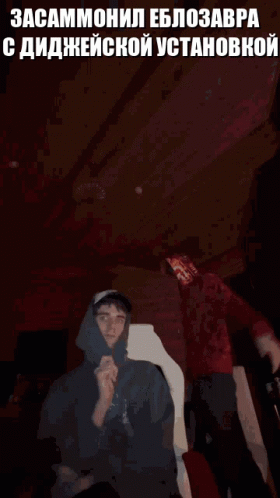 163onmyneck and Og Buda in a dark room, with a Russian caption about summoning a DJ dinosaur.