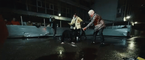 Og Buda and 163onmyneck with a group of people dancing in the rain on a wet street at night.