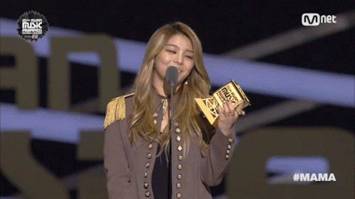 Ailee delivers an emotional acceptance speech at the 2015 Mnet Asian Music Awards, holding her award.