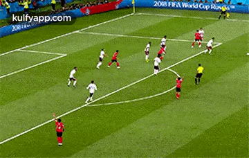 A football match from the 2018 FIFA World Cup in Russia, featuring players on the field near the goal.