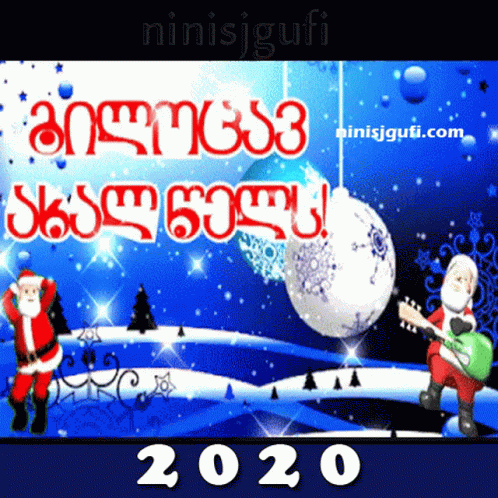 Animated New Year greeting for 2020 featuring two Santa figures, festive ornaments, and falling snow.