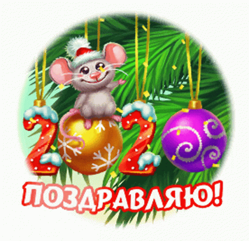 Cartoon mouse in a Santa hat on a 2020 Christmas ornament, wishing congratulations in Russian.