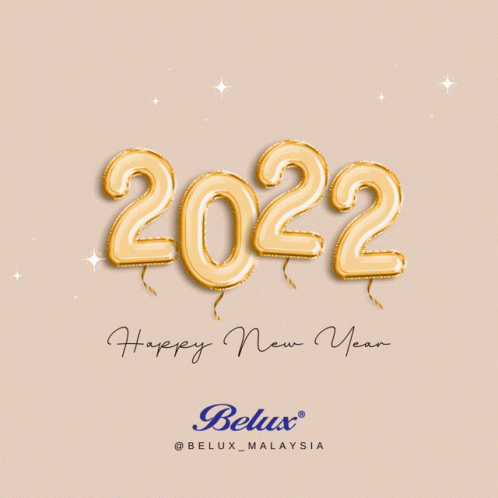 Belux Malaysia wishes a Happy New Year 2022 with golden balloon numbers and sparkling effects.