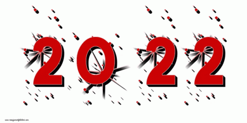 Stylized red '2022' graphic on a white background, celebrating the New Year with festive bursts.