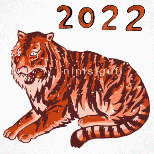 An animated illustration of a fierce tiger with sparkling effects, marking the year 2022.