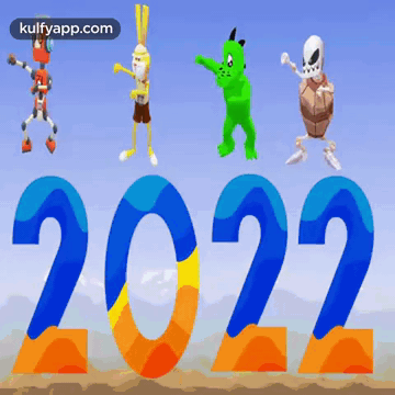 Animated characters dance above colorful '2022' numbers, celebrating the New Year with joy and cheer.