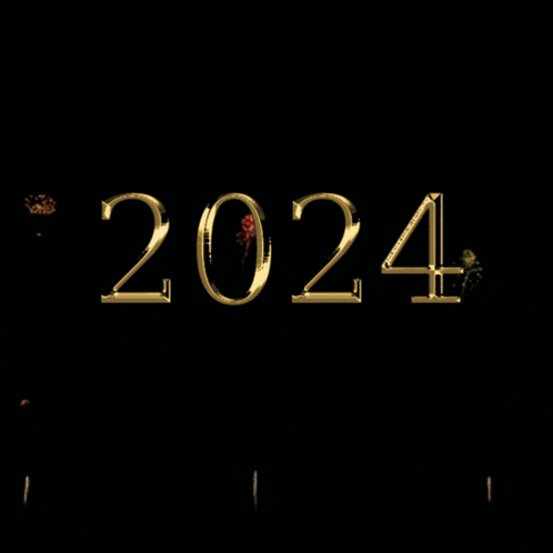 Golden '2024' text illuminated by vibrant fireworks celebrating the New Year.