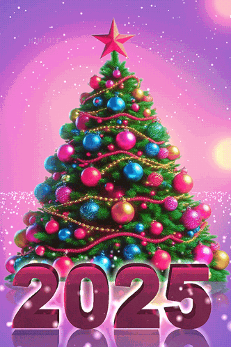 A festive Christmas tree with colorful ornaments and a red star, transitioning to display '2025' for the New Year.