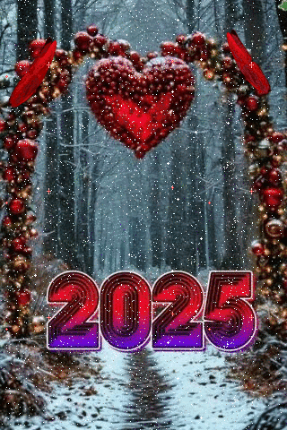 A festive winter scene celebrating 2025 with a sparkling red heart and butterflies in a snowy forest.