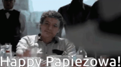 A man at a table with 'Happy Papieżowa!' text, referencing the 2137 Pope meme.