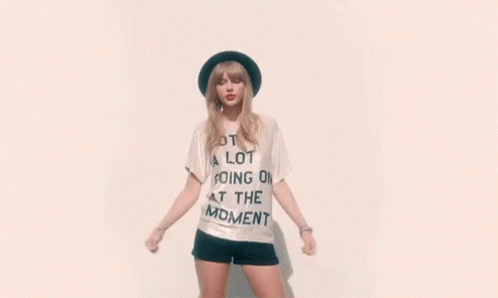Taylor Swift poses in her iconic '22' music video outfit, featuring a hat and a 'Not A Lot Going On' shirt.