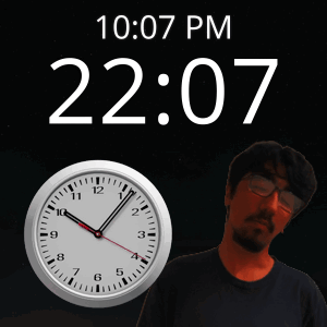 a man with glasses stands next to a clock that says 10:07 pm