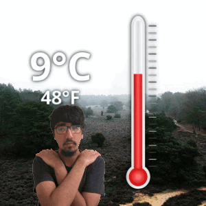 a man with glasses is standing in front of a thermometer that reads 9 degrees celsius