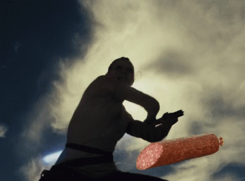 Silhouette figure with glowing sword slices various food items like sausage, egg, potato, and carrot.
