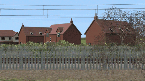 A computer-generated Avanti West Coast train showcases its changing liveries as it speeds past houses.
