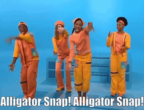 The Beat Team from 4 Square performs the energetic Alligator Snap dance in orange and yellow jumpsuits.